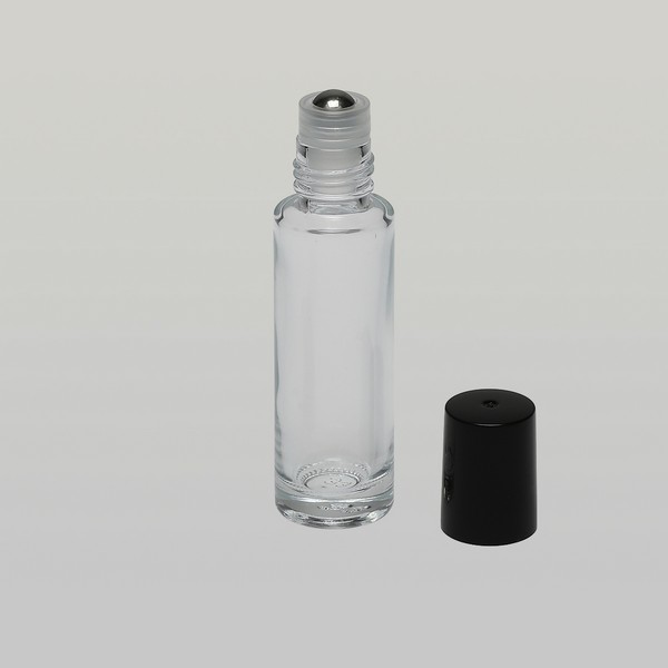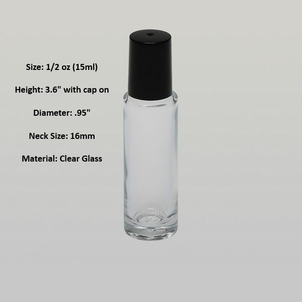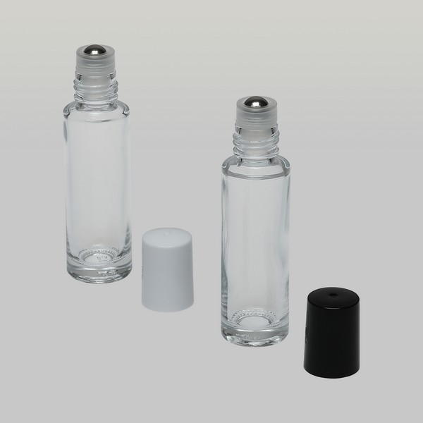 1/2 oz (15ml) Roll-On Cylinder Clear Glass Bottle (Stainless Steel Rollers, Black/White Caps)
