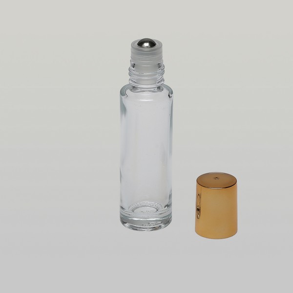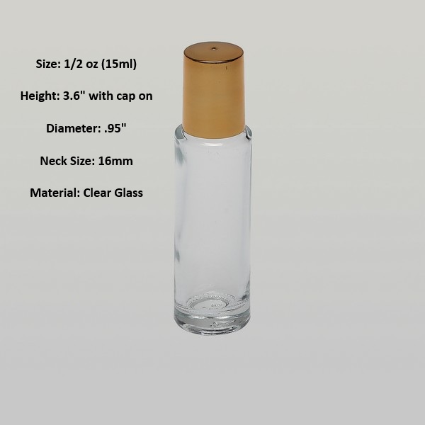 1/2 oz (15ml) Roll-On Cylinder Clear Glass Bottle (Stainless Steel Rollers, Gold/Silver Caps)