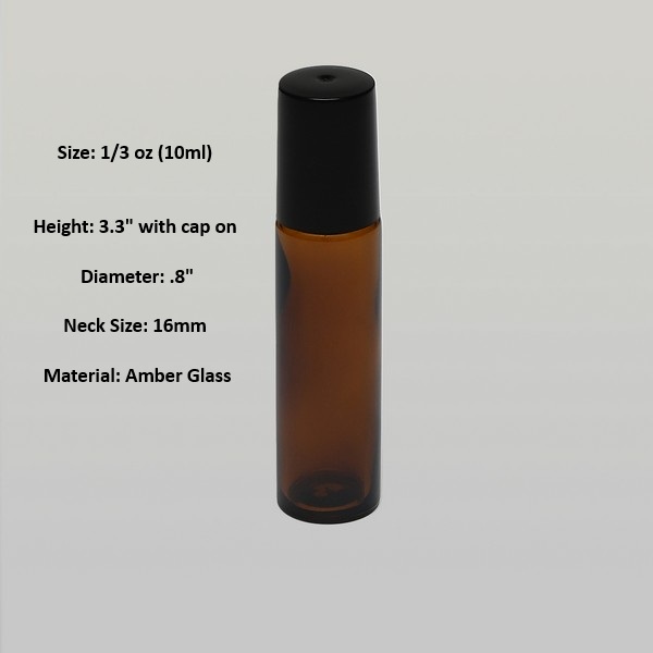 Size: 1/3 oz (10ml) Height: 3.3" with cap on Diameter: .8" Neck Size: 16mm Material: Amber Glass